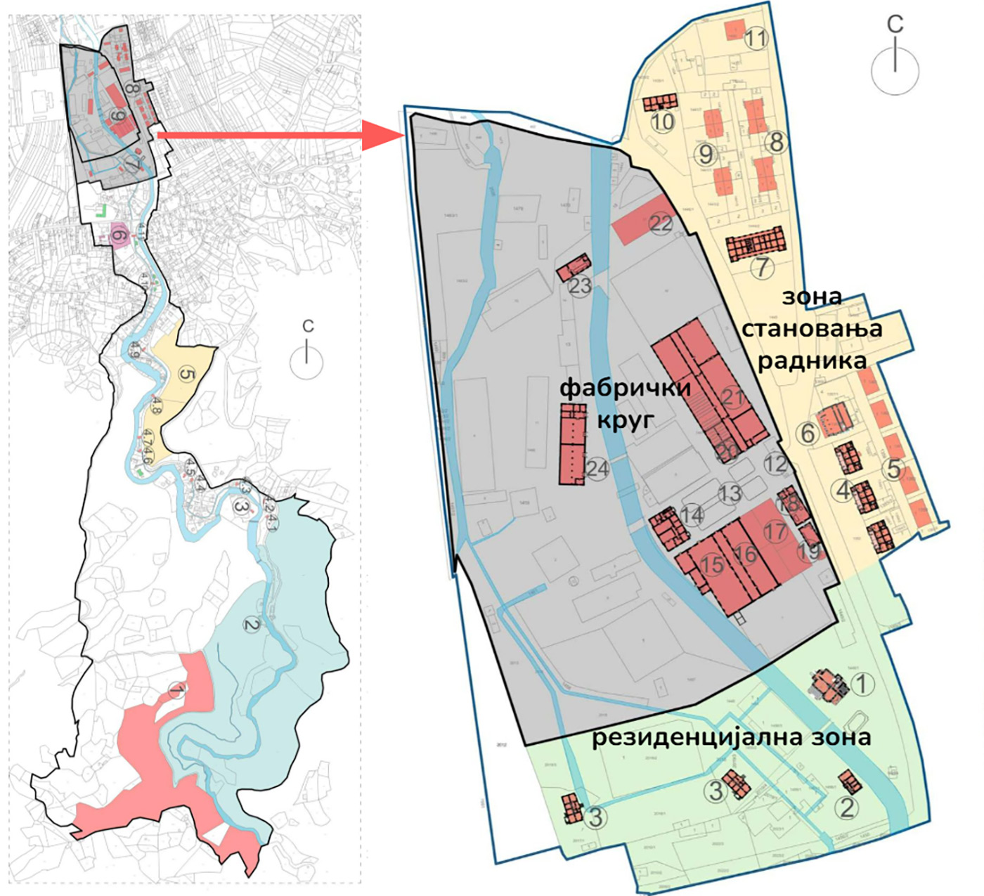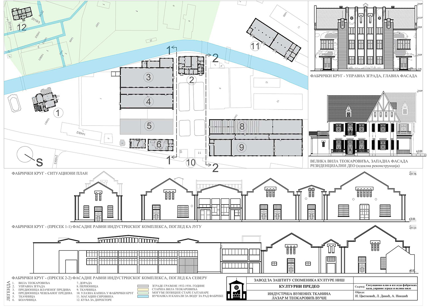 Целокупан комплекс фабрике осмишљен је и изведен у три просторне целине, и израдио га је архитекта Григорије Самојлов. Прва целина обухвата фабрички круг са управном зградом и фабричким халама, око које су формирани резиденцијални део са вилама породице Теокаровић, јужно од фабрике, и зона са становима за инжењере, чиновнике и квалификоване раднике – раднички кварт, источно од фабричког круга.